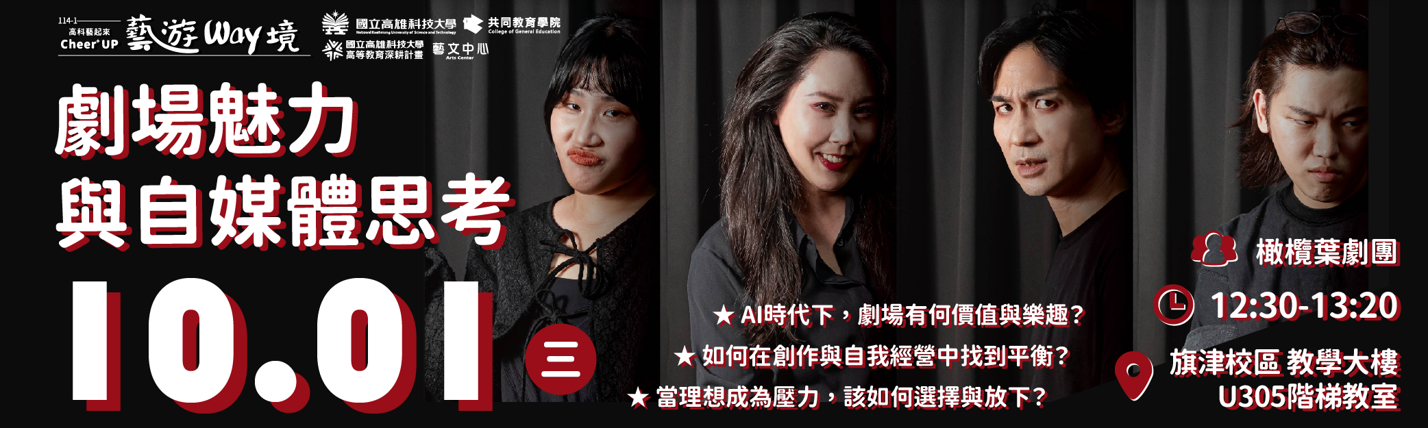 為推廣表演藝術並鼓勵青年思考創作價值,特別設計了校園互動講座,邀請高雄市高中與大專院校參與,由導演三毛率領核心演員團隊親自到校,以實演體驗、主題對談與現場互動的方式,帶領同學探討: